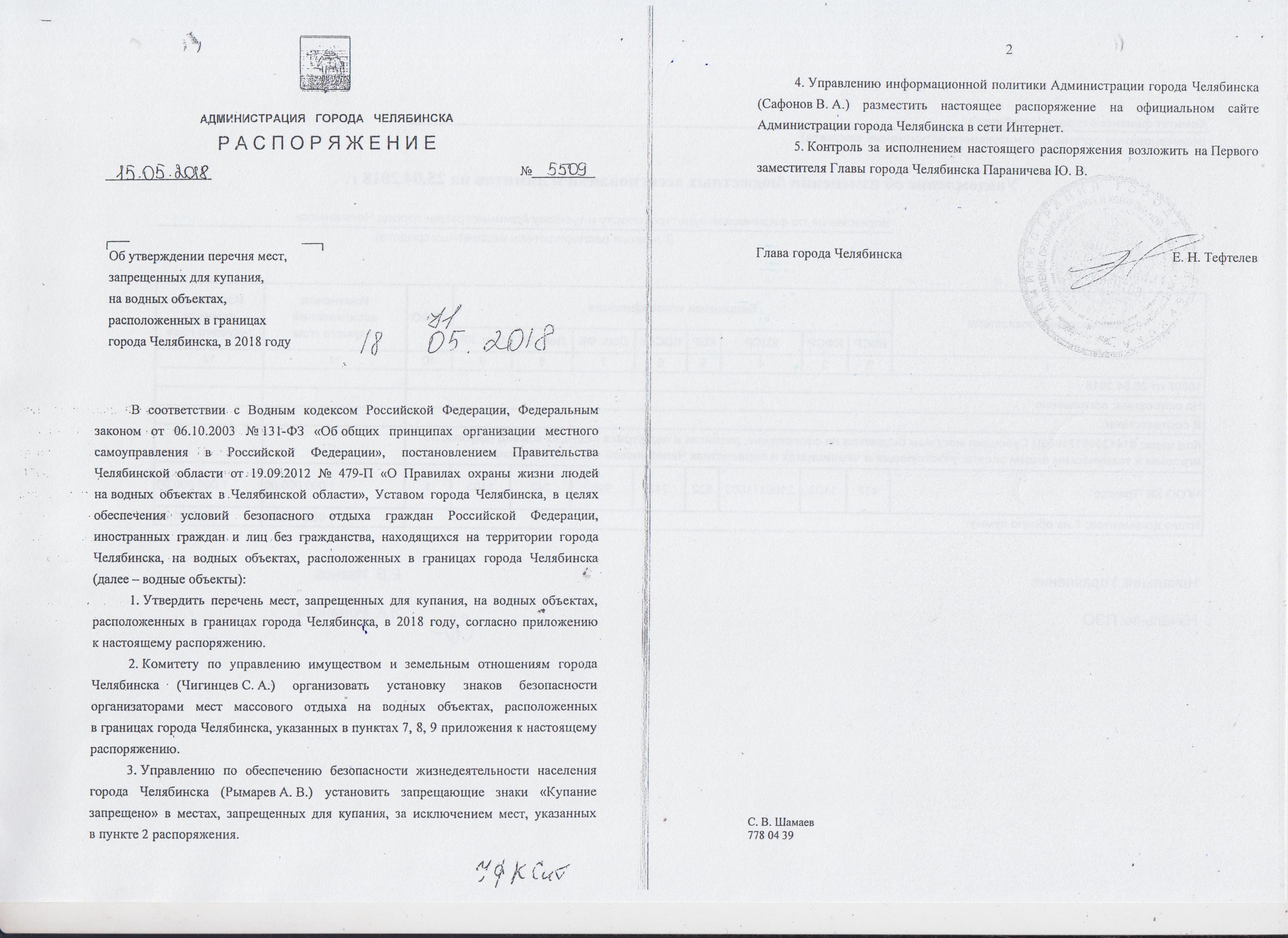 В соответствии с Распоряжением Главы города Челябинска Е.Н. Тефтелева от 15.05.2018 уведомляем вас о перечне мест, запрещенных для купания