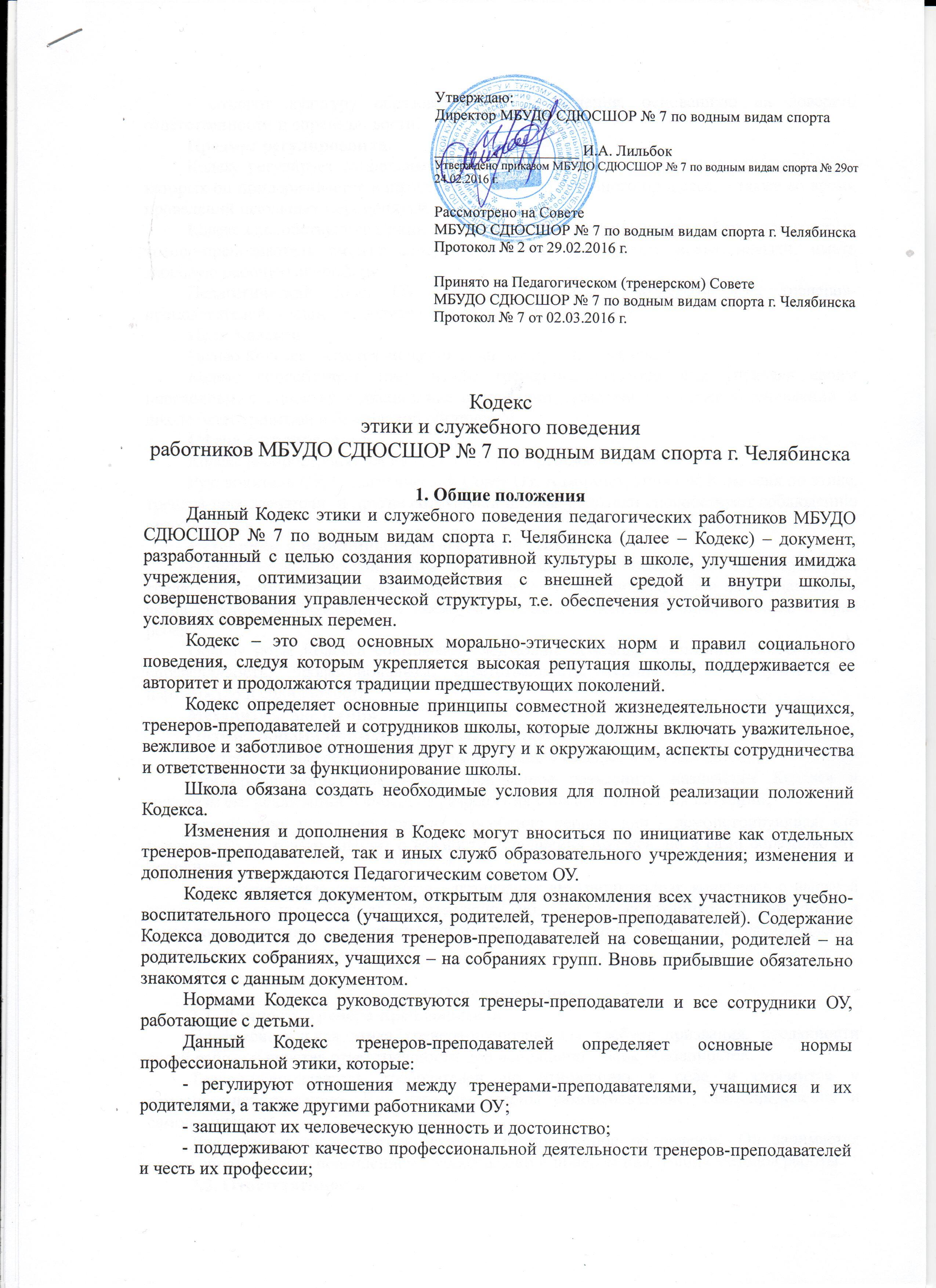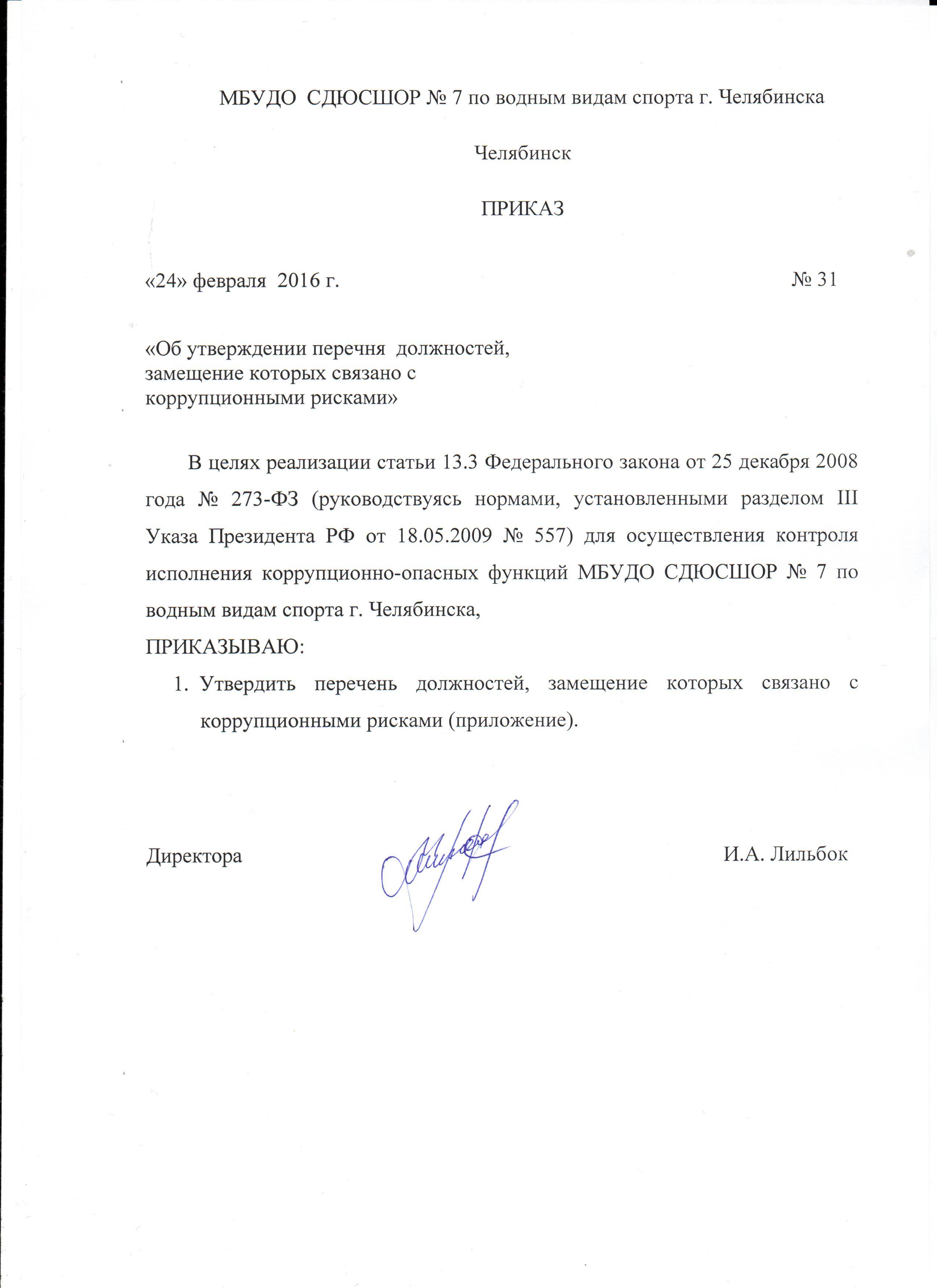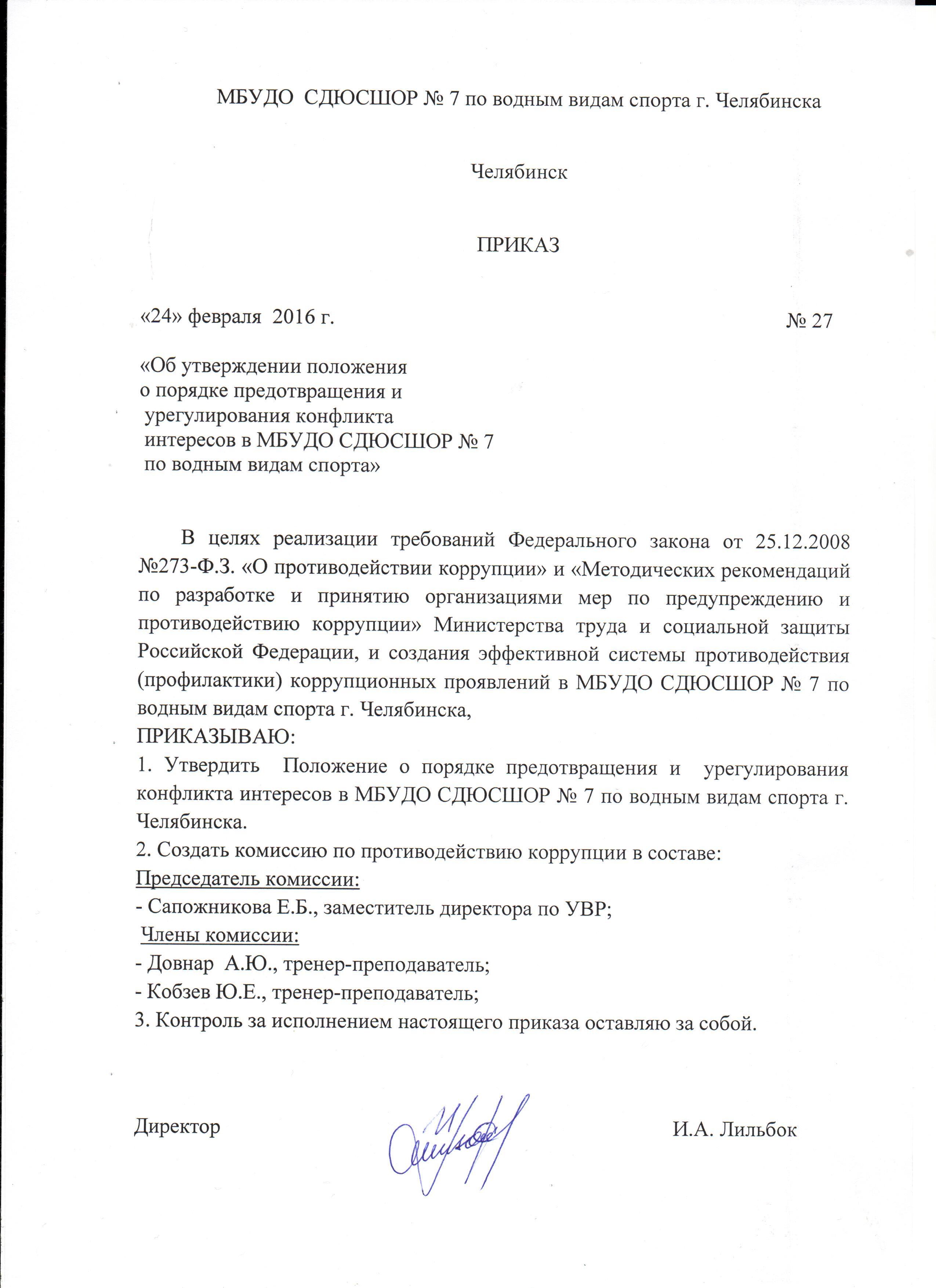 Приказ об утверждении положения о мерах по предотвращению и урегулированию конфликта интересов в МБУДО СДЮСШОР № 7 по водным видам спорта