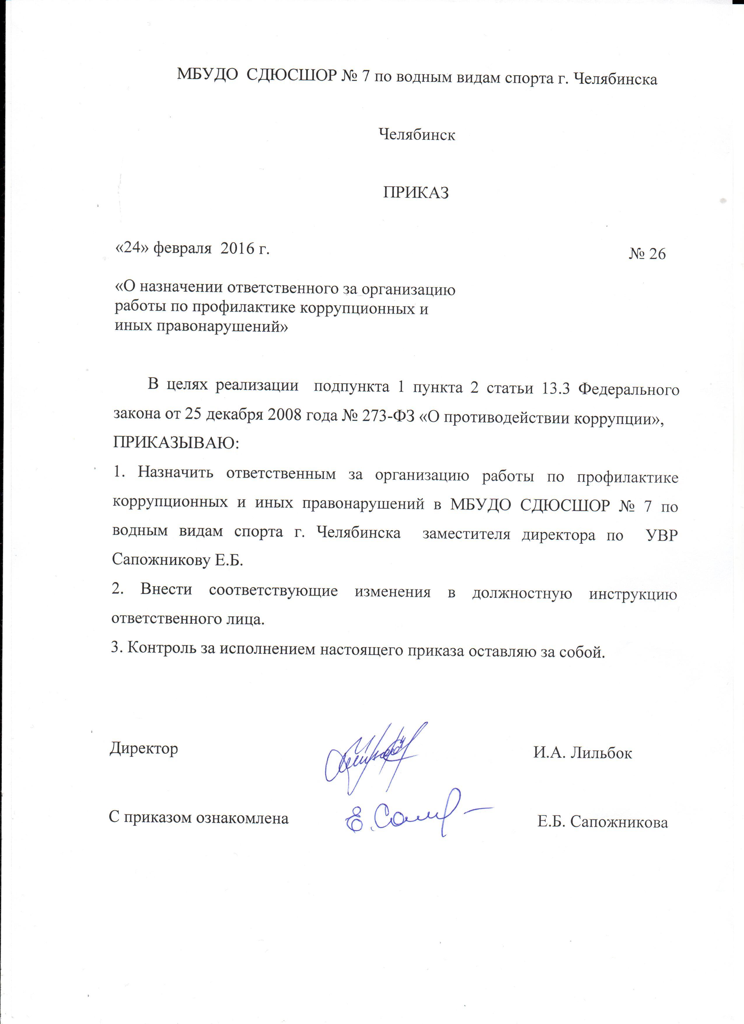 Приказ о назначении ответственного за организацию работы по профилактике коррупционных и иных правонарушений